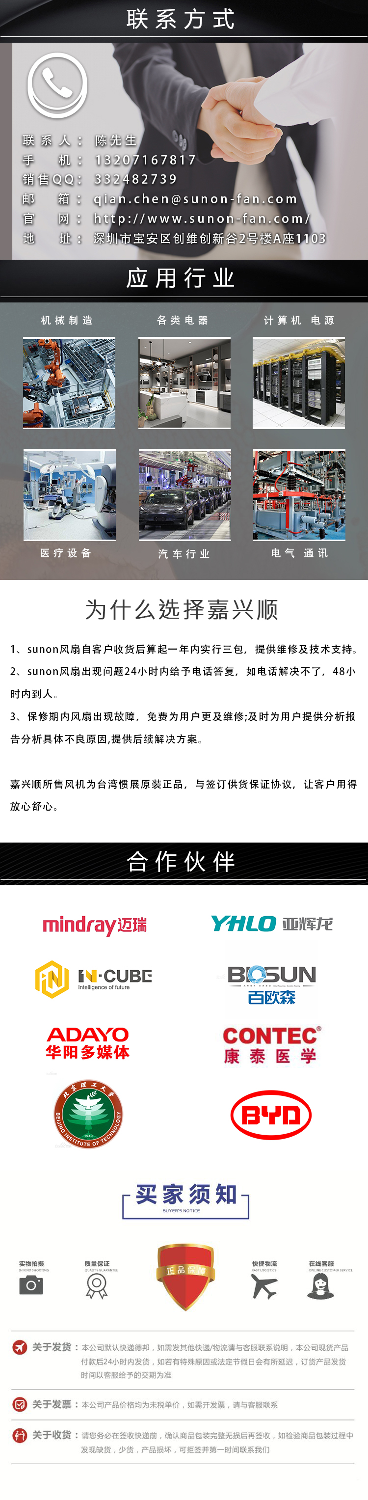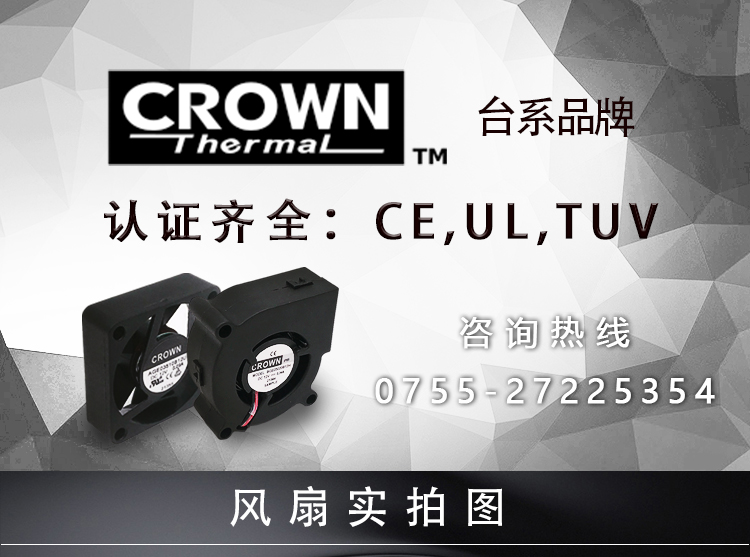Crown风扇品牌来自台湾,目前在散热风扇市场占据很大的份额,分别与苹果等多家知名品牌都有合作。AGE08015B12H是Crown惯展8015系列的型号之一,其电压为12V。为延长风扇的使用寿命,滚珠轴承风扇一律采用的是日本NMB进口双滚珠轴承,风扇框架和扇叶均采用PBT防火阻燃环保材料,使用寿命可达5-7万小时。可增加防水、防油以及耐腐蚀防护(最高可达IP68),可定制PWM调速、FG测速、RD报警功能,以及锁住保护,极性保护,缓启动,过流保护等保护功能。目前Crown风扇有多家代理商,Crown风扇批发请认准嘉兴顺电子科技。