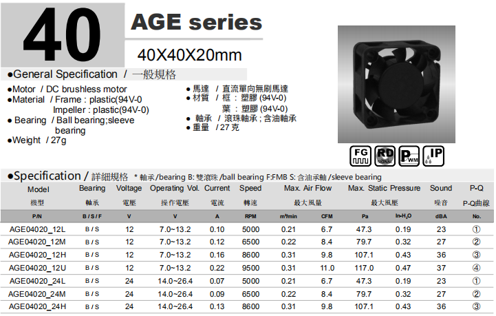 | 噪音 (dBA) | 36 | 尺寸(mm) | 40X40X20 |