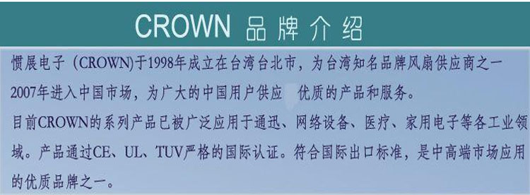 Crown风扇品牌来自台湾,目前在散热风扇市场占据很大的份额,分别与苹果等多家知名品牌都有合作。AGE04020B12L是Crown惯展4020系列的型号之一,其电压为12V。目前Crown风扇有多家代理商,Crown风扇批发请认准嘉兴顺电子科技。