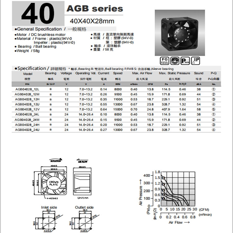 | 品牌 | Crown | 风扇型号 | AGB04028B24U |